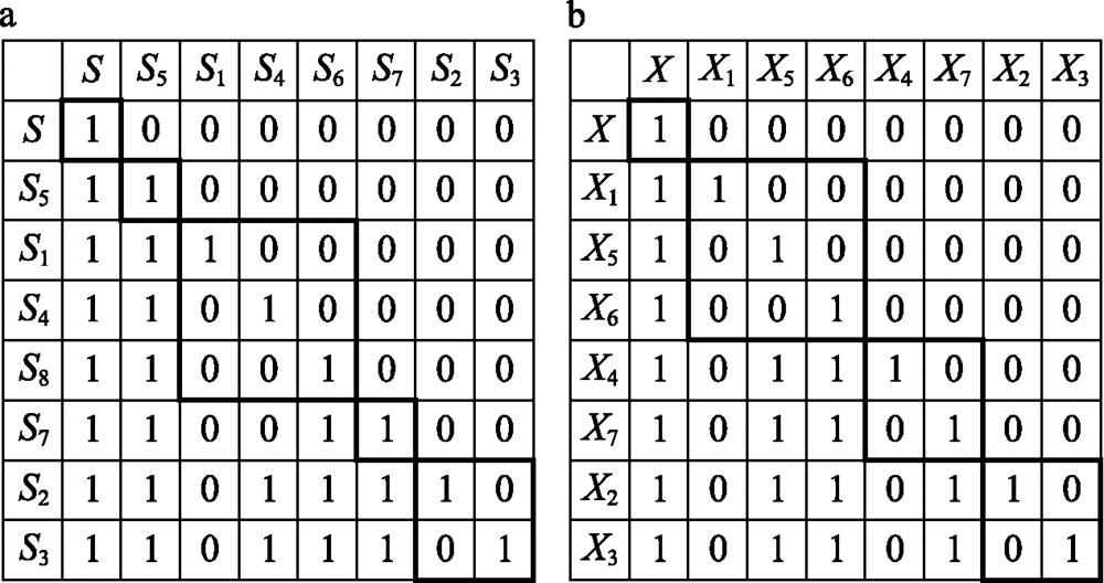 | 图2 影响因素ISM分析排序后的可达矩阵:质量农业(a)和服务农业(b) |