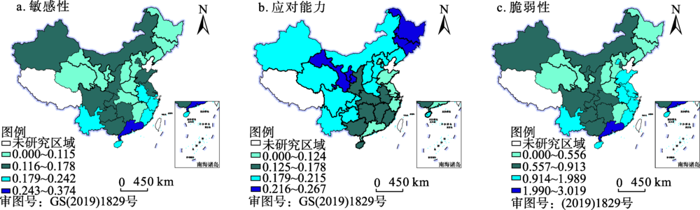 | 图2 2017年中国各省(市、区)旅游经济系统敏感性(a)、应对能力(b)、脆弱性(c)等级空间分布图 |