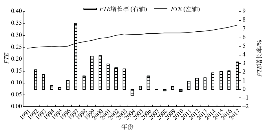 | 图1 1991—2017年中国农业化肥施用技术效率及其年均增长率 |