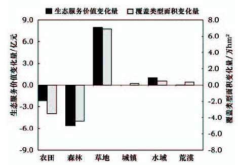 Figure 6 Net change of different land cover area and ecosystem services value between 2000 and 2012图6 2000-2012年不同地表覆盖类型面积与生态服务价值净变化量 |
