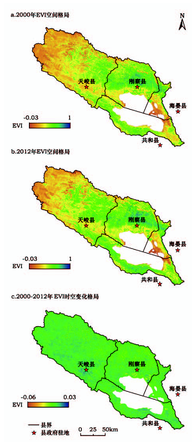 Figure 3 Spatial pattern variation of the maximum EVI in Qinghai Lake watershed during 2000 to 2012图3 2000-2012年青海湖流域年内最大EVI空间格局及其变化 |