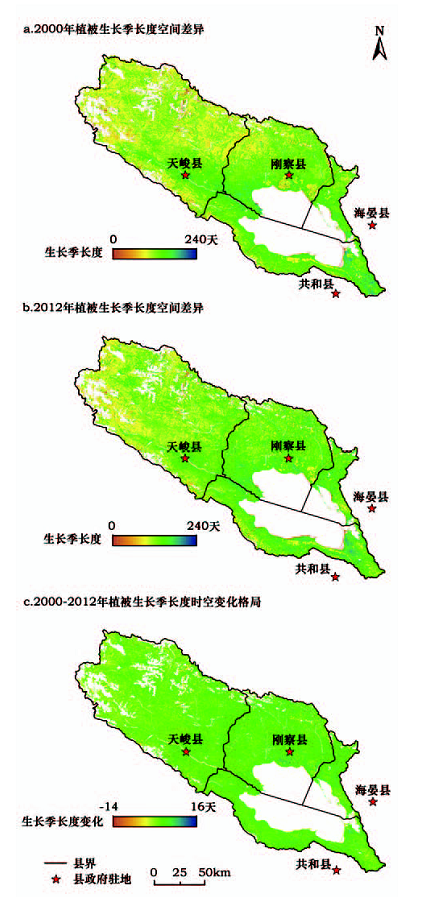 Figure 4 Spatial pattern variation of the growing season in Qinghai Lake watershed during 2000 to 2012图4 2000-2012年青海湖流域植被生长季长度空间差异及其变化 |