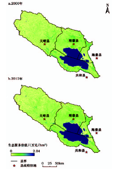 Figure 5 Spatial pattern of ecosystem service values in Qinghai Lake watershed图5 青海湖流域生态服务价值空间格局 |