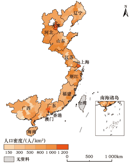 Figure 6 The distribution of population density of China 's coastal areas in 2014 |
