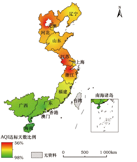 Figure 4 The spatial distribution of AQI of China 's coastal areas in 2014 |