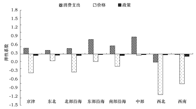 Figure 1 The elastic coefficient of influencing factors of urban household energy consumption图1 中国各区域城镇生活能源消费影响因素的弹性系数 |