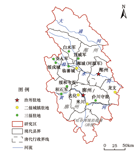 Figure 3 The schematic diagram of administrative boundaries in Tang Dynasty图3 唐代行政界线示意 |
