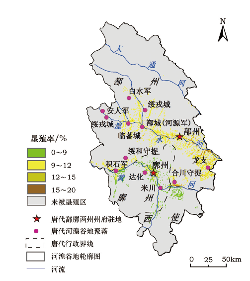 典型区域历史时期高分辨率的土地利用/土地覆盖变化重建对研究过去全球环境变化和全球气候变化具有十分重要的意义。公元733年(唐代开元二十一年)是河湟谷地以军事屯田为主的农业发展的峰值期,是其屯田规模最为宏大、效益空前、原始土地覆盖影响最为深刻的时段。本文收集、整理了公元733年河湟谷地历史文献中的耕地数据,运用青藏高原河湟谷地区耕地网格化重建方法,结合历史时期聚落分布的实际状况,对耕地分布进行二次分配,分析并重建了公元733年前后河湟谷地耕地资源规模以及分布格局。结果显示:①公元733年河湟地区耕地开垦以军事屯田为主,共有123屯,估算出屯田总面积为321.13km2;②耕地空间分布主要以聚落为中心,以河流为中心线向外扩散,集中分布在湟水干流区域以及黄河河谷区域中的串珠状盆地内,受海拔高度和山地地形因素的限制,加之当时人口较少,耕地面积有限,全区仅有11.7%的网格有耕地分布;③垦殖强度受到自然条件和生产力水平的双重影响,垦殖率整体偏低,处于农业发展的成长期;全区耕地网格平均垦殖率为9.2%,最高垦殖率仅为18.9%,其中有31.4%的耕地网格垦殖率在9.0%以下,67.6%的耕地网格垦殖率在9.0%~15.0%之间,1.0%的耕地网格垦殖率达到15.0%~20.0%之间;④垦殖强度在行政单元之间具有明显的差异性,鄯州垦殖率较高,平均垦殖率接近13%;廓州垦殖率较低,南部西使地区垦殖率最低。