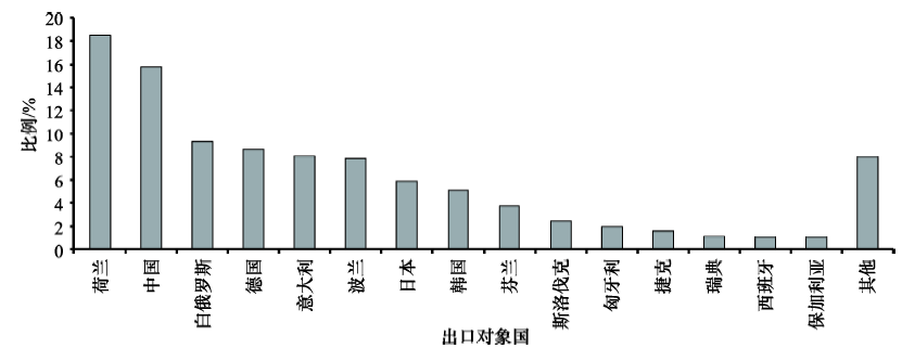 Figure 3 The share of different market countries in Russia's total oil export in 2015图3 2015年俄罗斯向各石油出口对象国出口的石油量占俄罗斯石油出口总量的比例 |
