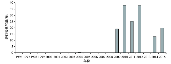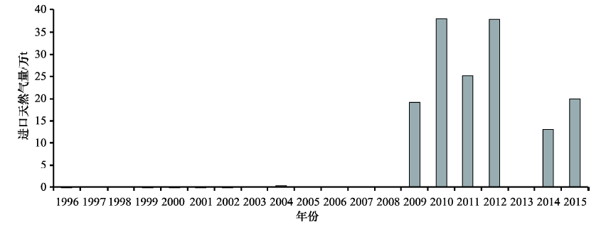 Figure 4 The volume of gas that china imported from Russia from 1996 to 2015图4 1996—2015年中国从俄罗斯进口的天然气量 |