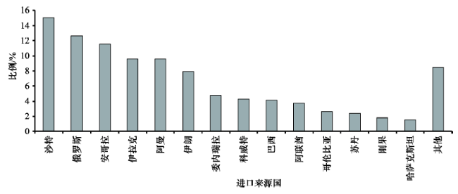 Figure 2 The share of different source countries in China's total oil import in 2015图2 2015年中国从各石油进口来源国进口的石油量占中国石油进口总量的比例 |