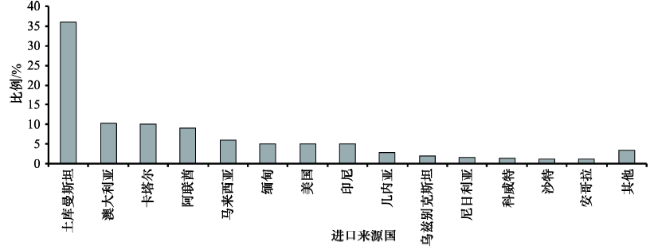 Figure 5 The share of different source countries in China's total gas import in 2015图5 2015年中国从各天然气进口来源国进口的天然气量占中国天然气进口总量的比例 |