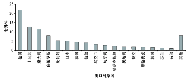 Figure 6 The share of different market countries in Russia's total gas export in 2015图6 2015年俄罗斯向各天然气出口对象国出口的天然气量占天然气出口总量的比例 |