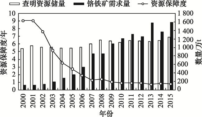| 资源因素 | 资源保障度/年 | 查明资源储量与消费量比值。反映了在外界资源供应中断情况下,国内资源的可支撑程度 | :查明资源储量 :铬铁矿表观消费量 | |