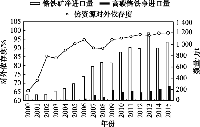 | 对外依存度/% | 净进口量与消费量的比值。反映了对国外资源的依赖程度 | :铬资源净进口量 | ||