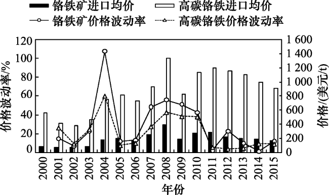 Figure 3 The average price of imported chromium resources and its price fluctuation in China from 2000 to 2015图3 2000—2015年中国铬资源进口均价及价格波动率 数据来源:联合国商品贸易统计数据库[25] |