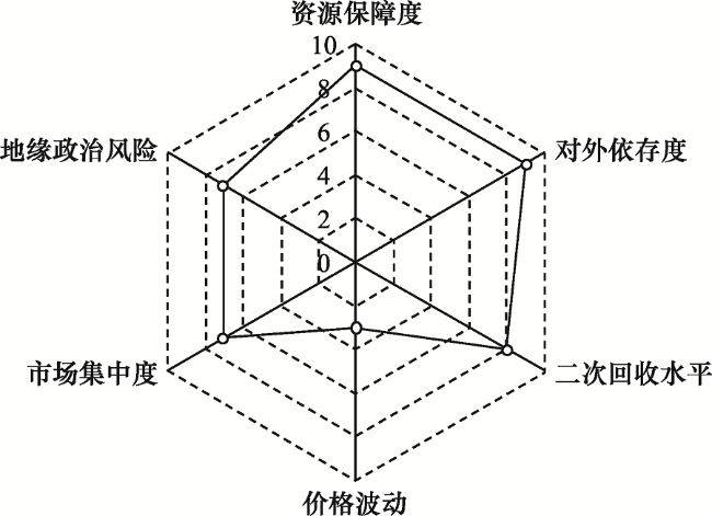 Figure 5 The radar chart of the supply risk assessment on chromium resources in China图5 中国铬资源供应风险总体评价雷达图 |