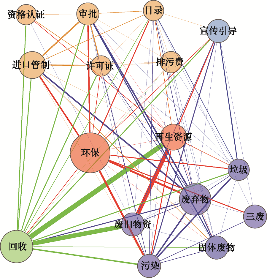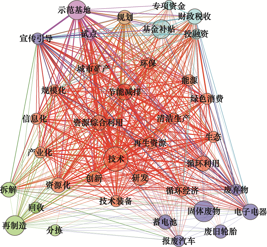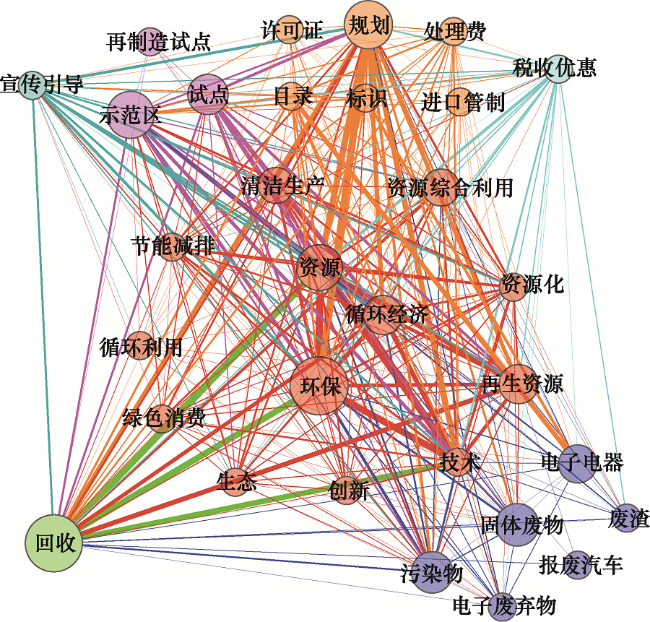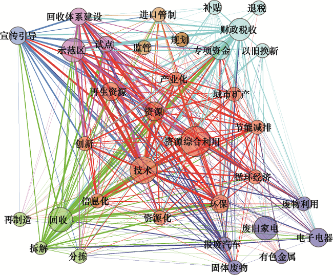 Figure 6 Keywords network graph of China's resource recycling industry policies from 2012 to 2016图6 2012—2016年中国资源循环利用产业政策关键词网络分布 |