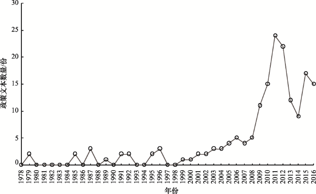 Figure 1 The quantitative distribution of Chinese national resource recycling industry policies from 1978 to 2016图1 1978—2016年中国中央政府资源循环利用产业政策数量分布 |