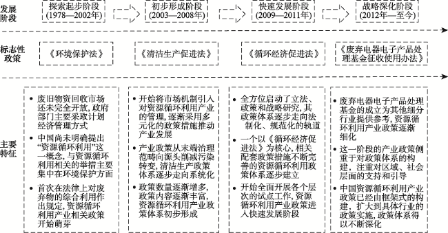 Figure 2 The division of the evolution stage of China's resource recycling industry policies and landmark policies and main features图2 中国资源循环利用产业政策演进阶段划分及标志性政策、主要特征 |