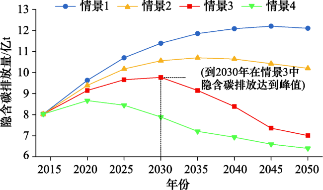 Figure 5 Embodied carbon emissions in China's petroleum industry from 2015 to 2050图5 2015—2050年中国石油行业隐含碳排放量 |
