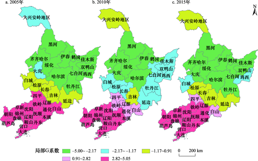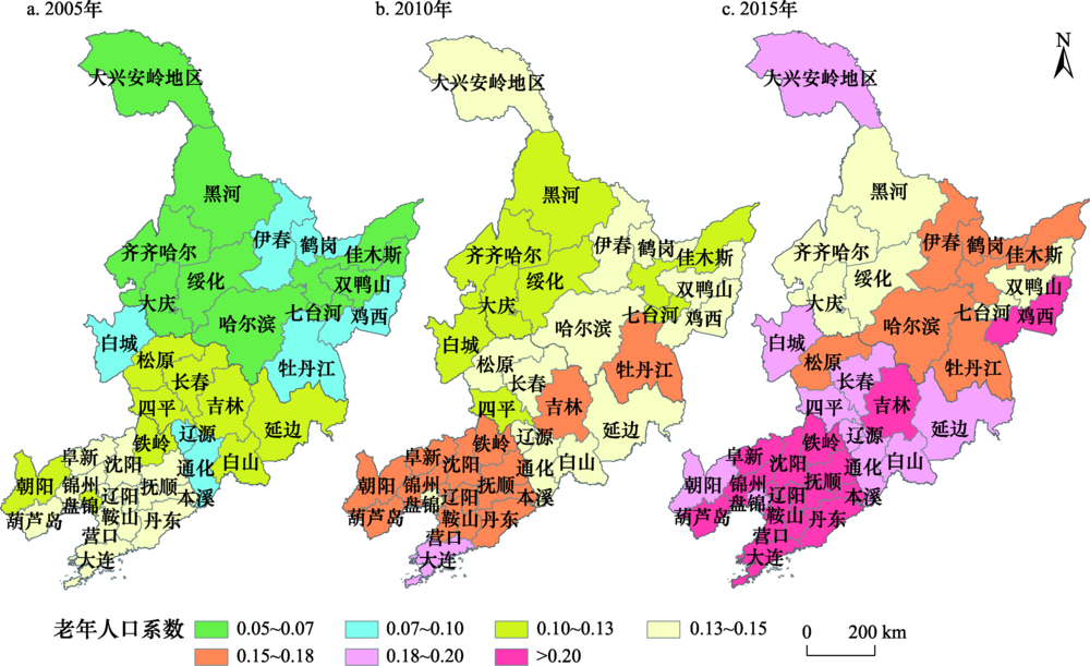 Figure 3 Evolution of spatial pattern of urbanization aging in cities of the three provinces in Northeast China,in 2005,2010 and 2015图3 2005年、2010年、2015年东北三省各城市老龄化空间格局演变 |