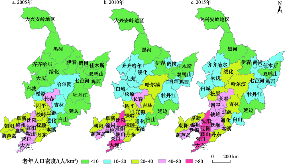 Figure 2 Density distribution of elderly population in cities of the three provinces in Northeast China,in 2005,2010 and 2015图2 2005年、2010年、2015年东北三省各城市老年人口密度分布 |