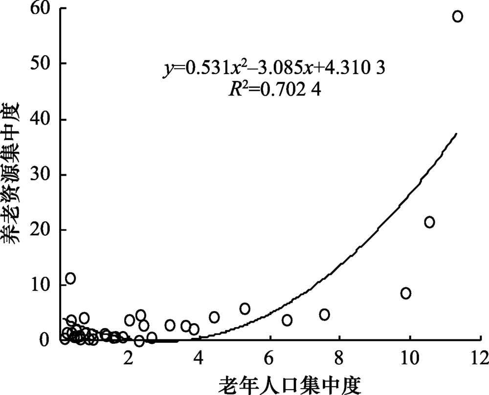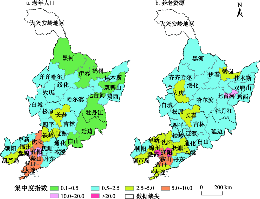 Figure 4 Distribution of concentration of elderly population and concentration of pension resources of the three provinces in Northeast China,in 2015图4 2015年东北三省老年人口集中度与养老资源集中度分布 |