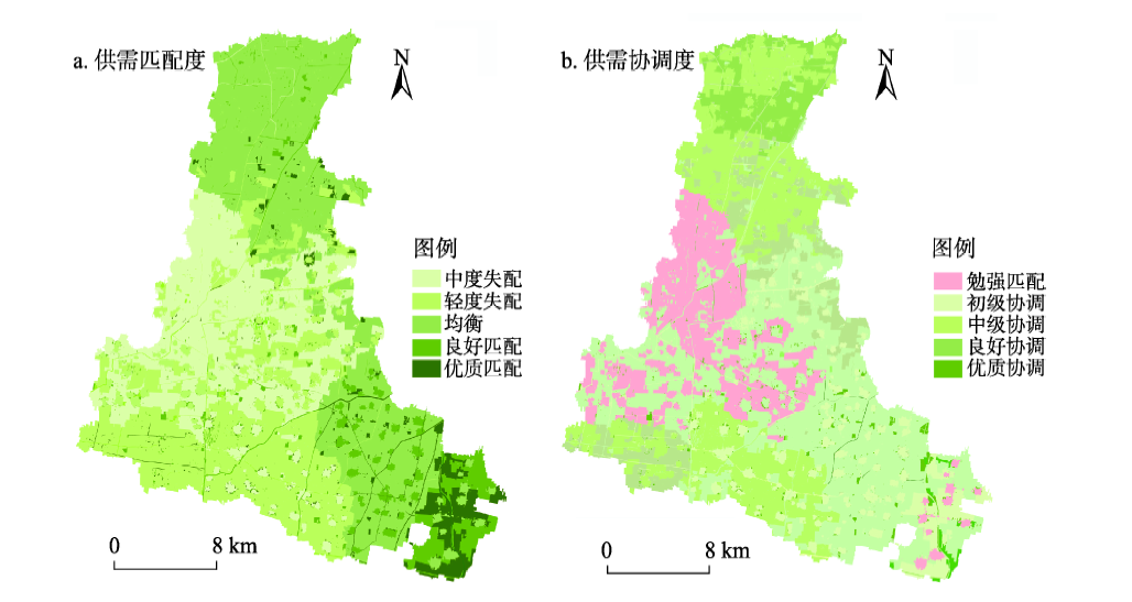 Figure 4 Spatial distribution of ecosystem service supply and demand matching degree (a) and coordination degree (b) of Quzhou County, 2015图4 2015年曲周县生态系统服务供需匹配度(a)、供需协调度(b)空间分布 |