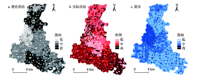 Figure 3 Spatial distribution of ecosystem service potential (a), flow (b), and demand (c) matrices for Quzhou County, 2015图3 2015年曲周县生态系统服务潜在供给(a)、实际供给(b)、需求(c)空间分布 |