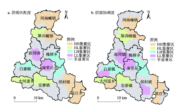 Figure 5 Local spatial agglomeration of ecosystem service supply and demand matching degree (a) and coordination degree (b) of Quzhou County, 2015图5 2015年曲周县生态系统服务供需匹配度(a)、供需协调度(b)局部空间自相关分布 |