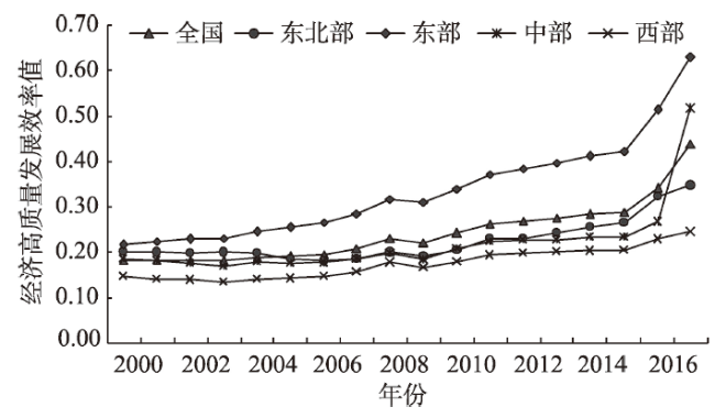科技创新在区域经济发展模式转型中具有重要作用,也对经济高质量发展的提升有着重要影响。本文以中国30个省(区、市)为研究对象,利用Super-SBM模型测算2000—2017年中国经济高质量发展效率并分析其时空演变特征,通过空间面板数据回归模型探究科技创新对经济高质量发展的驱动机制,得出以下结论:①经济高质量发展效率在时间上整体呈上升态势,平均值从2000年的0.18上升至2017年的0.44,在空间上大致由东部沿海向中西部递减;②从整体回归结果看,科技创新各要素(专利授权数、R&D经费占GDP比重、R&D人员全时当量)对经济高质量发展的驱动作用较强,控制变量中的城镇化水平和市场化程度对经济高质量发展也存在正向的驱动作用,而产业结构和环境规制则表现为抑制作用;③从四大地区的回归结果看,不同地区经济高质量发展受科技创新各要素的驱动影响存在较大差异,东部地区受专利授权数、R&D经费占GDP比重的驱动作用较强,专利授权数、R&D经费占GDP比重、R&D人员全时当量均对西部地区有正向驱动作用,而中部地区和东北地区分别只受专利授权数和R&D人员全时当量的驱动影响。本文可为国家和地区提高科技创新和经济高质量发展水平提供借鉴。