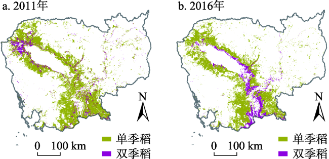 柬埔寨可耕地资源丰富,温度适宜,水稻生产极具潜力。及时监测水稻种植时空格局对于区域水稻生产管理、灾害风险评估和粮食政策制定具有重要意义。传统的水稻遥感监测研究大多只提供年际尺度的水稻空间分布,缺乏年内尺度水稻种植与收获信息。本文首先利用一年内所有可获取的MODIS影像,构建基于像元的MODIS NDVI年时间序列曲线;然后,选取最大值、最小值、均值和标准差逐像元计算时序统计参数特征,采用FastDTW算法计算像元时序曲线与水稻参考时序曲线的相似性特征,将时序统计特征与时序曲线相似度特征相结合,利用随机森林分类器,通过机器学习进行监督分类,提取水稻熟制信息;最后,结合时序曲线提取水稻物候特征,生成水稻收获时间信息,并对水稻耕作类型进行识别。研究表明:①柬埔寨水稻种植主要集中在洞里萨湖周围的低地平原和南部的湄公河下游。尽管柬埔寨全年热量条件适宜,但水资源获取限制对柬埔寨水稻种植时空格局具有显著影响。②水稻熟制以单季稻为主,约占全年水稻种植面积的80%,且分布区域稳定;双季稻面积约占20%,年际种植空间分布变化较大。雨季稻是柬埔寨水稻的主要种植类型,种植面积约占全年水稻面积的70%左右,年际变化不大;旱季稻和前雨季稻面积约占30%,年际空间分布差异显著。③对2011年和2016年水稻种植模式分析可知,灌溉条件和洪水对柬埔寨水稻种植时空具有重要影响。本文通过对柬埔寨年内水稻种植时空格局的高精度监测,识别其主要影响因素,为制定因地制宜和有弹性的水稻种植制度、保障柬埔寨粮食安全提供借鉴。