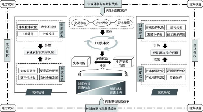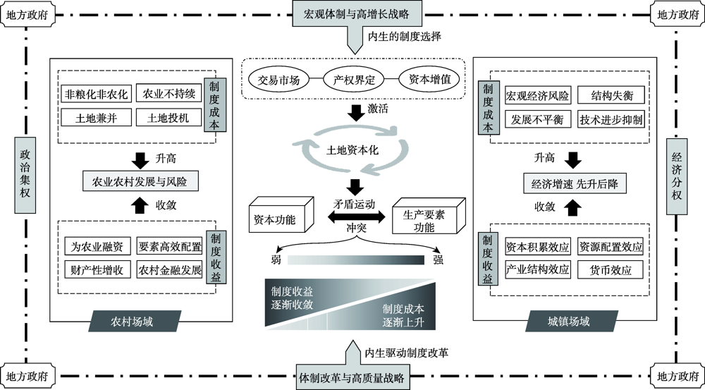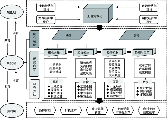 以中国土地资本化为主题,根据发展脉络与逻辑关系对已有文献进行分析和总结,并展望未来研究趋势。结论表明:①已有研究围绕土地资本化这一中心变量,立足城镇和农村两个场域,“理论层—研究层—实践层”三个层次互促共进,构成“概念内涵—经济效应—经济机制—治理与改革”四大板块内容,成果为多项热点领域改革提供了参考,最终形成了“一个中心—两个场域—三个层次—四大板块—五项改革”的系统框架;②无论在城镇还是农村,土地资本化都是一把“双刃剑”,如何把握其合理的“度”以趋利避害,已成为改革发展需直面的重大科学问题;③城镇土地资本化研究应强化微观经济分析和理论模型构建,农村土地资本化研究亟待构建系统性理论分析框架和丰富实证研究;④中国经济转型与乡村振兴将延拓土地资本化研究域,实践中的新问题、新情况将为研究提供新空间。未来研究应立足土地基本属性与特殊性,重视土地经济规律凝练与理论创新,为进一步的土地制度改革提供理论遵循。