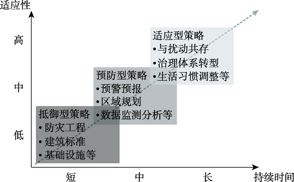 | 1990s—2005年 | 特定灾害框架 | 生态、地貌等自然维度 | 系统要素型 | 模型模拟、阈值分析 | 防灾抗灾工程建设等抵御型策略 |