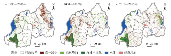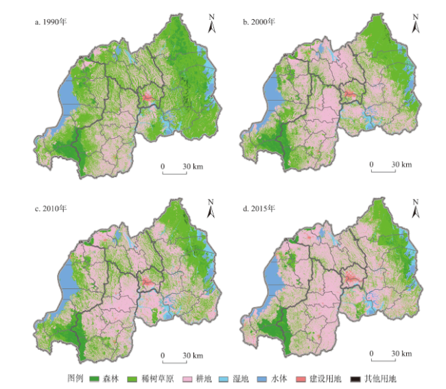 表3 1990—2015年卢旺达主要土地覆盖类型的面积变化情况Table 3 Area changes of main land cover types in Rwanda, 1990-2015 |