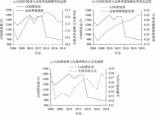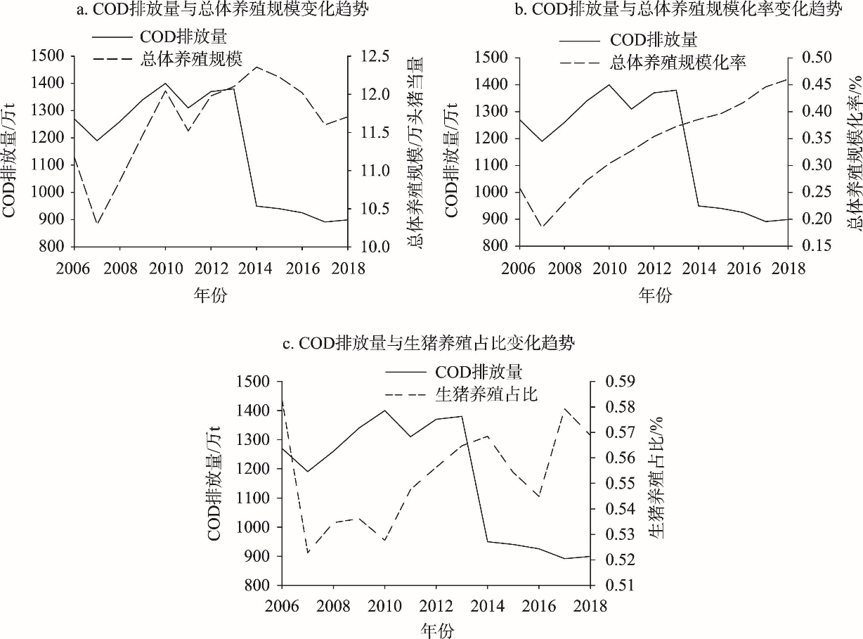 图1 2006—2018年中国畜禽养殖化学需氧量(COD)排放量与总体养殖规模、规模化率及生猪养殖占比的变化趋势注:化学需氧量(COD)排放量根据《第一次全国污染源普查数据集》和各省份公布的《第二次全国污染源普查公报》核算得到。 Figure 1 Changes in COD emissions from livestock and poultry breeding in China from 2006 to 2018 and the overall breeding scale, scaling-up rate, and proportion of pig breeding |