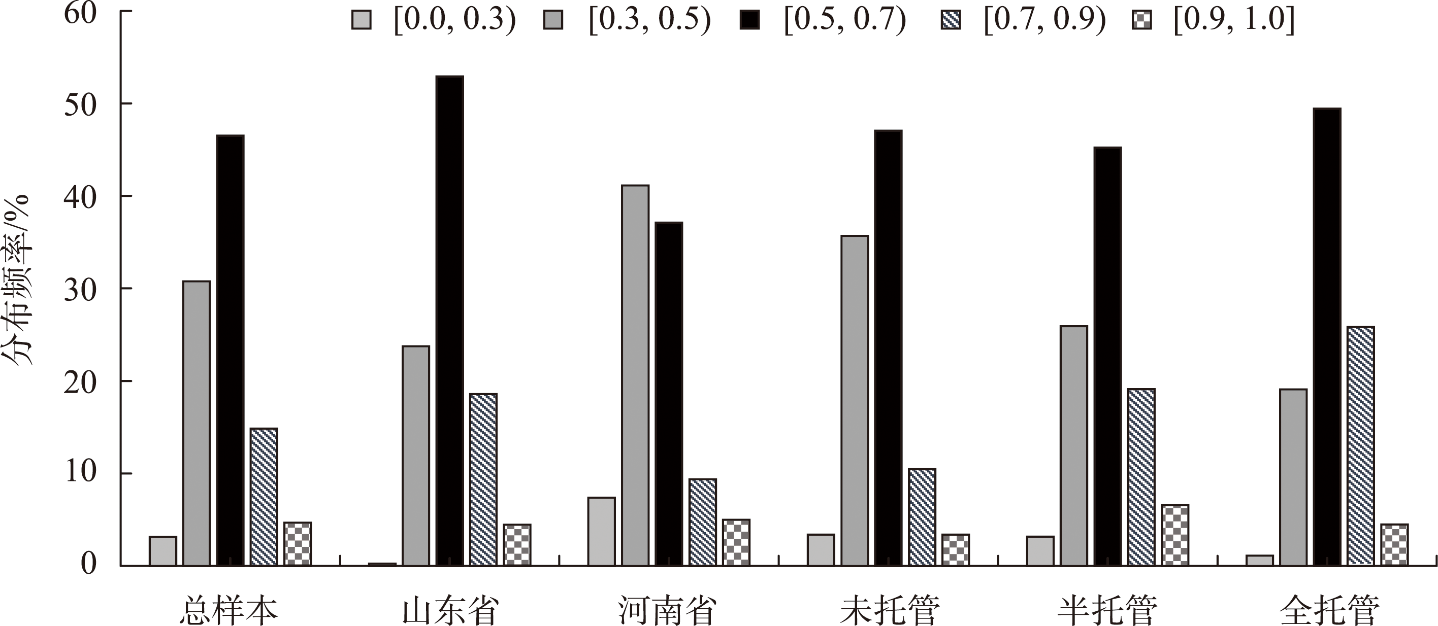 【目的】作为标准化、专业化和统一化的服务模式,农业生产托管在破解资源环境约束、推动农业绿色发展方面具有显著优势。研判生产托管的绿色发展效应,对于保障中国粮食安全、推动农业现代化发展具有重要意义。【方法】基于山东、河南两省1238份小麦种植户的调研数据,构建非期望产出的SBM模型测算粮食绿色生产效率,理论分析并实证检验生产托管对农户粮食绿色生产效率的影响。【结果】研究发现:①样本地区小麦种植户的绿色生产效率均值为0.575,整体绿色发展水平不高;②生产托管能够显著提升农户的绿色生产效率,考虑了内生性问题及采用多种方式进行稳健性检验后,生产托管的正向影响依旧显著;③生产托管对于绿色生产效率处于中等偏高群体的农户绿色发展效应更强;与山东相比,河南农户生产托管对绿色生产效率的提升作用更强;与小规模户、低非农化程度的农户相比,生产托管对实际经营规模偏大、非农化程度偏高的农户绿色发展效应更强。【结论】本文证实了农业生产托管在粮食绿色生产效率提升中发挥的关键作用,这为继续完善优化农业生产托管服务和加快农业绿色发展转型提供了可靠的经验证据和政策启示。