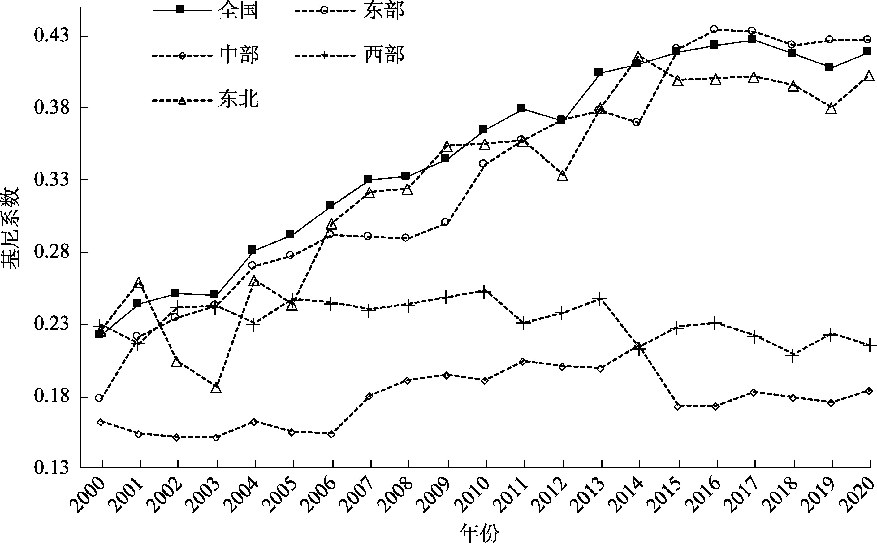 表1 2000—2020年中国各大区域间口粮自给率差异的基尼系数Table 1 Gini coefficient of the difference of ration self-sufficiency rate among different regions in China, 2000-2020 |