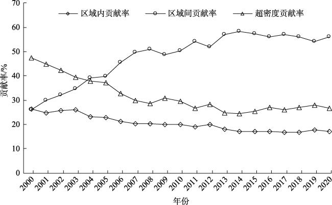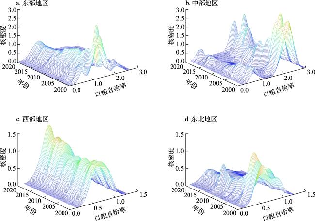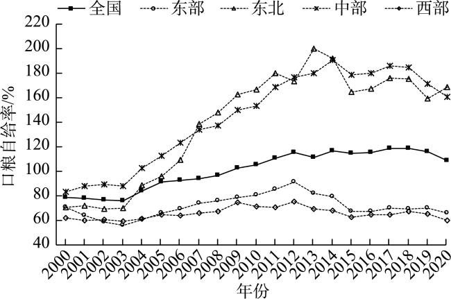 图3 2000—2020年全国及四大区域内口粮自给率基尼系数Figure 3 Gini coefficient of ration self-sufficiency rate in China and its four regions, 2000-2020 |