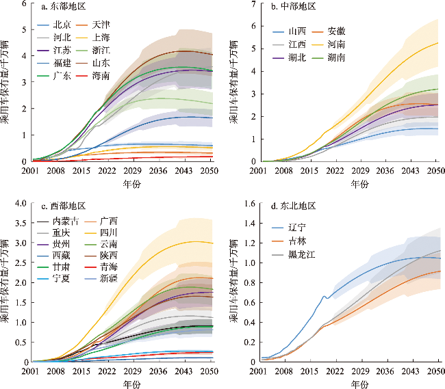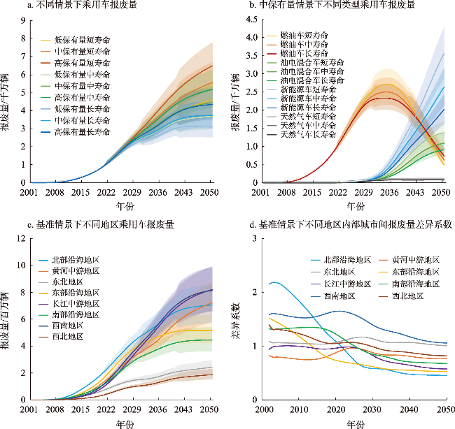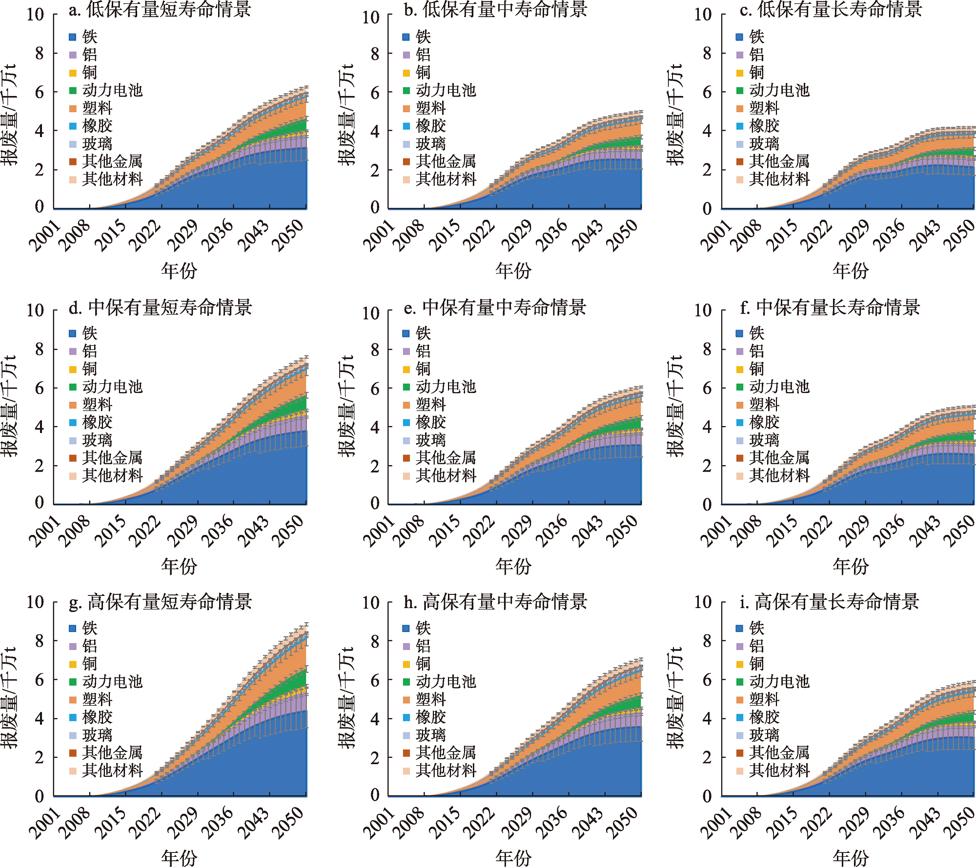 【目的】中国乘用车保有量的迅速增长对资源供给和环境承载力构成了巨大压力。分析乘用车行业报废资源的发展趋势,不仅有助于理解资源流动的时空演变规律,还能为优化资源循环利用体系、推动新能源汽车产业可持续发展提供关键数据支撑和政策启示。【方法】本文基于龚伯兹模型和动态物质流模型,构建了中国4个直辖市和333个地级行政区乘用车保有量与报废量的预测框架,系统分析了2001—2050年乘用车中的不同报废资源的时空分布格局。【结果】①2050年中国乘用车保有量将达到4.5亿~6.4亿辆,呈现显著的区域不平衡,其中,河南、山东、河北、广东等省份乘用车保有量显著高于其他地区。②2050年乘用车报废量将达到3094万~6476万辆,空间分布呈现出由沿海城市向内陆省会城市转移的趋势,东部沿海、长江中游、黄河中游以及西南地区将成为集中报废区域。③随着新能源车和油电混合车的普及,其报废量将逐步超过传统燃油车,导致铝、铜及动力电池等关键材料的报废量大幅增长。④汽车使用寿命和保有量水平是影响乘用车及车用材料报废量的关键驱动要素,对资源代谢的长期趋势具有显著调控作用。【结论】本文研究结果可为资源循环利用产业的产能规划、区域差异化政策制定以及新能源汽车材料回收体系的构建提供科学依据,助力中国实现“双碳”目标与循环经济转型。