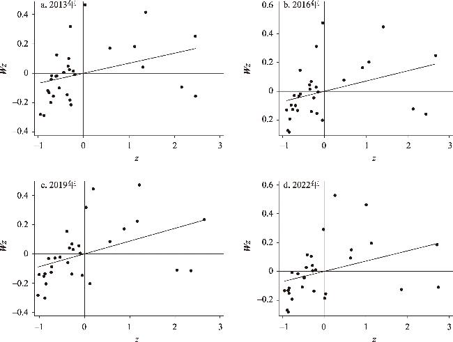 表5 2013年、2016年、2019年和2022年地理距离权重矩阵下高-高型、低-低型数字基础设施发展水平省份Table 5 Provinces with HH-type and LL-type digital infrastructure development levels under geographical distance weight matrix in 2013, 2016, 2019, and 2022 |