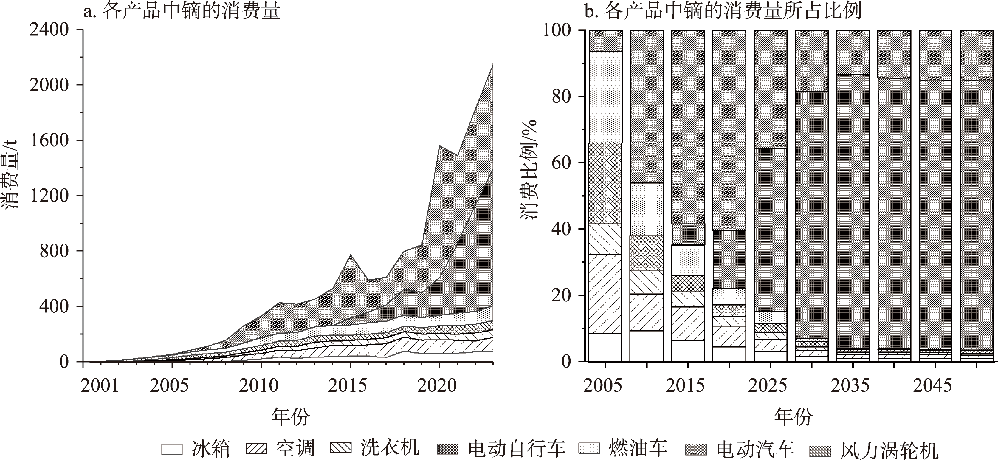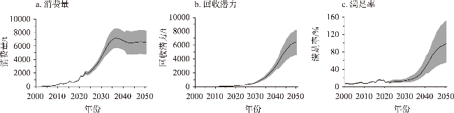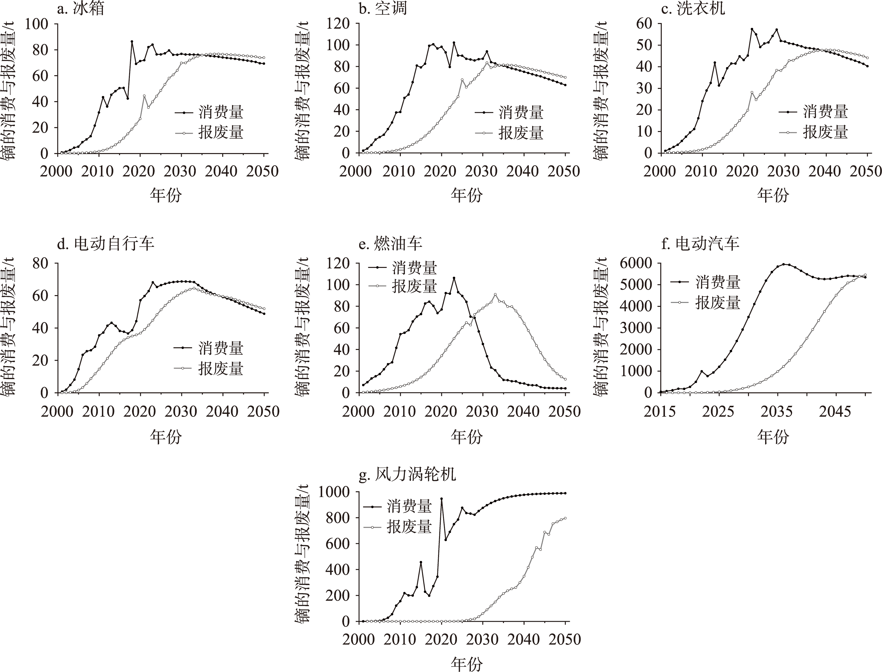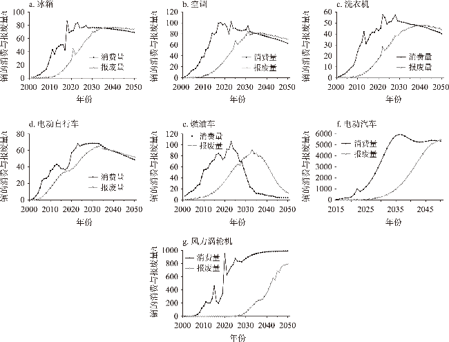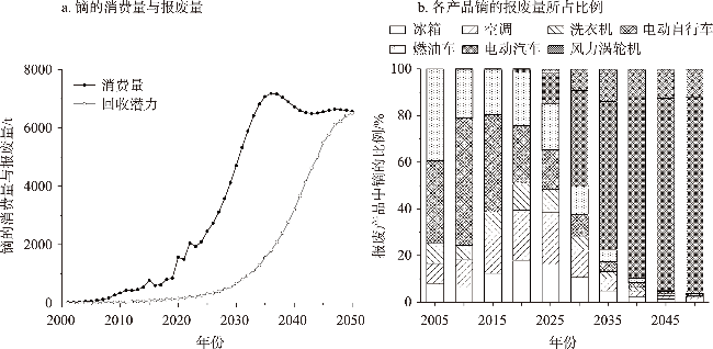【目的】 “城市矿产”二次资源在资源可持续供给方面发挥着越来越重要的作用,镝是一种重要的稀土资源,被广泛应用于家用电器、汽车、风力涡轮机等产品中,如何精确评估镝回收潜力是迫切需要解决的科学问题。【方法】 本文通过物质流分析的自下而上方法,核算了2001—2023年中国金属镝的消费量,并预测2024—2050年镝的消费和报废状况,评估从“城市矿产”中回收镝的潜力。【结果】 ①镝的消费量在2001—2023年间迅速扩大,主要应用于风力涡轮机、电动汽车和空调中。②2024—2050年,家用电器、汽车和电动自行车对镝的消费量将呈现先升后降的趋势,风力涡轮机对镝的消费量持续上升;③镝消费量将在2036年增长至峰值,约为7200 t,随后下降至2042年的约6600 t,并趋于平稳,消费主要集中在电动汽车和风力涡轮机中。④随着产品报废量的增加,镝的回收潜力持续上升,在2050年达到约6500 t,预计回收潜力可以满足相关产业发展需求。【结论】 尽管中国镝的储量位于世界前列,但目前的开采量难以满足未来产品对镝的需求。因此,需要发展循环经济,从“城市矿产”中回收镝以弥补需求缺口,降低原生矿产开采压力,保障镝资源供给安全。