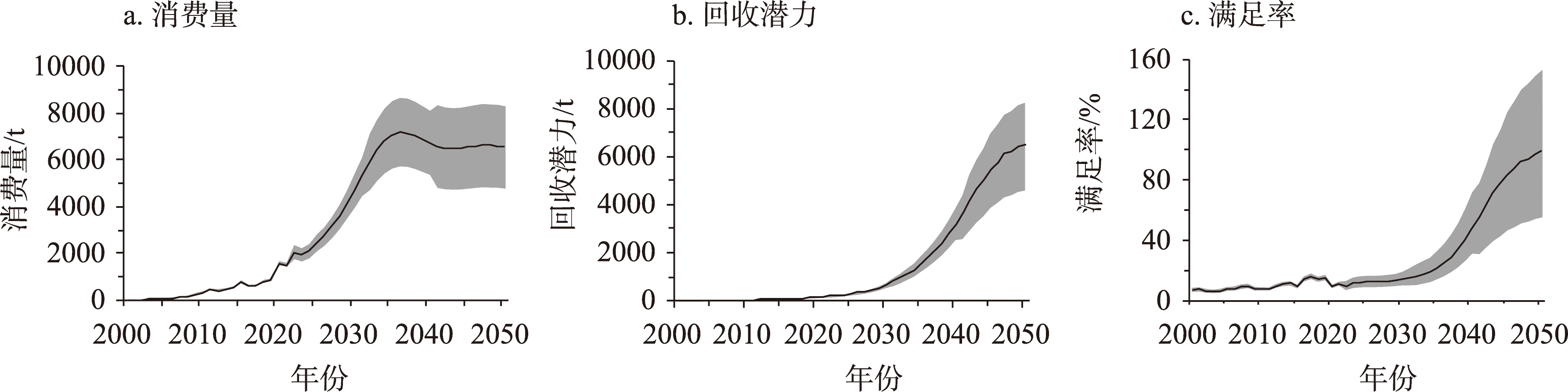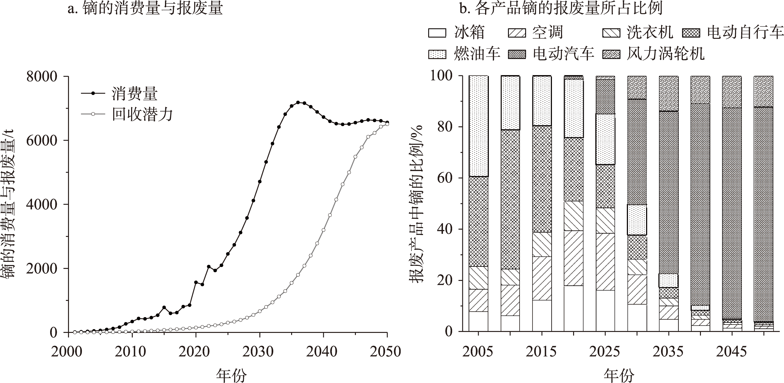 [Objective] Secondary resources from “urban minerals” play an increasingly significant role in the sustainable supply of resources. Dysprosium is an important rare earth element widely used in products such as household appliances, automobiles, and wind turbines. Accurately assessing the recycling potential of dysprosium is an urgent scientific issue that needs to be addressed. [Methods] This study used a bottom-up approach to calculate the consumption of dysprosium in China from 2001 to 2023. The consumption and scrap conditions of dysprosium from 2024 to 2050 were predicted to assess the recycling potential of dysprosium from “urban minerals”. [Results] (1) The consumption of dysprosium increased rapidly from 2001 to 2023, primarily being applied in wind turbines, electric vehicles, and air conditioners. (2) From 2024 to 2050, dysprosium consumption in household appliances, automobiles, and e-bikes would first increase and then decline, while consumption in wind turbines would continue to rise. (3) Dysprosium consumption would peak at about 7200 t by 2042, then remain relatively stable at about 6600 t between 2041 and 2050, mainly concentrated in electric vehicles and wind turbines. (4) With the increase of product scrap, the recycling potential of dysprosium would continuously rise, reaching about 6500 t by 2050, which is expected to meet the future demand. [Conclusion] Although China ranks among the world’s top holders of dysprosium reserves, the current mining volume is unlikely to meet future product demand. Therefore, it is necessary to develop a circular economy and recycle dysprosium from “urban minerals” to fill the demand gap, reduce the pressure on primary mineral extraction, and ensure the security of dysprosium resource supply.