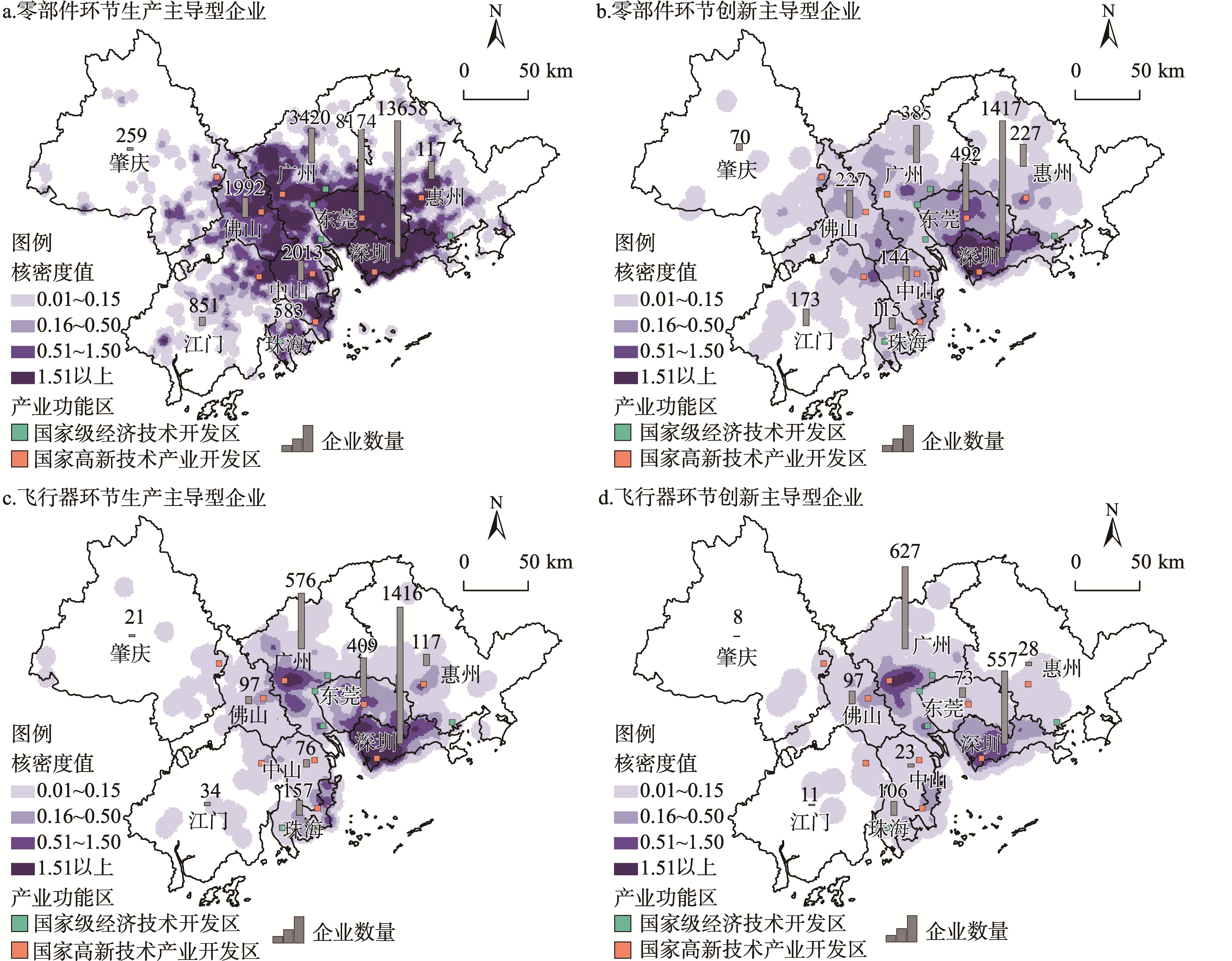 【目的】 本文旨在厘清低空经济制造业空间分布及其产业链与创新链的时空关联模式与影响因素,为低空经济产创融合提供理论依据和政策支撑。【方法】 在获取截至2025年2月的珠三角城市群低空经济制造业零部件与飞行器环节企业数据的基础上,分别利用核密度分析、协同区位分析与无序多分类逻辑回归模型,探究低空经济制造业的空间集聚性、产业链与创新链的时空关联模式及其影响因素。【结果】 ①珠三角城市群低空经济制造业生产主导型和创新主导型两类企业均呈现显著的广州-深圳双核结构,企业主要分布于各类产业功能区与中心城区。②低空经济制造业生产-创新的时空关联表现为生产主导型企业引领创新主导型企业的时空关联特征,产业链与创新链的时空关联均表现为零部件环节追随飞行器环节、但飞行器环节趋于独立集聚的时空关联模式。③不同时空关联模式受产业功能区等级、集群类型、机场距离、土地价格、经济活力与企业规模等因素综合影响,其中国家级产业功能区的作用较为突出。【结论】 珠三角城市群低空经济制造业初步形成生产-创新、产业链与创新链协同集聚格局,但区域整体协同集聚程度仍有待提升,建设并提升产业功能区能级是推动企业协同集聚的关键。
