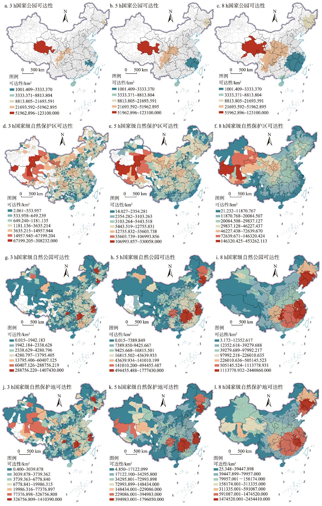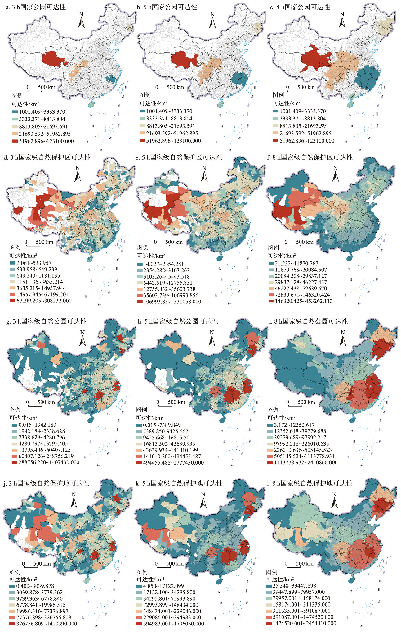 [Objective] This study analyzes the accessibility to various types of protected areas and their influencing factors at the national scale, aiming to provide a basis for balancing ecological conservation and development utilization in these areas. [Methods] Based on data from 3464 national-level protected areas in 2021 (national parks, national nature reserves, and national natural parks), this study used the Travel O-D Point Intelligent Query System (TIQS) and Geodetector to investigate the differences in the accessibility to national-level protected areas, their influencing factors, and the spatial relationship between accessibility and population distribution across 2846 county-level administrative divisions. [Results] (1) Accessibility to national parks and national nature reserves showed a pattern of “high in the northwest and low in the southeast”, while national natural parks showed a pattern of “high in the southeast and low in the northwest”. The accessibility to the three types of protected areas formed a spatial complementary pattern. (2) Elevation, terrain relief, and county area were the dominant factors affecting the accessibility to national parks and national nature reserves, while protected area density and elevation were the dominant factors affecting the accessibility to national natural parks. (3) The contradictions and pressures between ecological conservation and human activities faced by the three types of national-level protected areas exhibit significant differences. [Conclusion] There are notable spatial disparities and complementary relationships in accessibility among different types of national-level protected areas. Differentiated conservation and development strategies should be formulated by taking into account multiple factors such as population distribution, resource endowment, and economic development level.