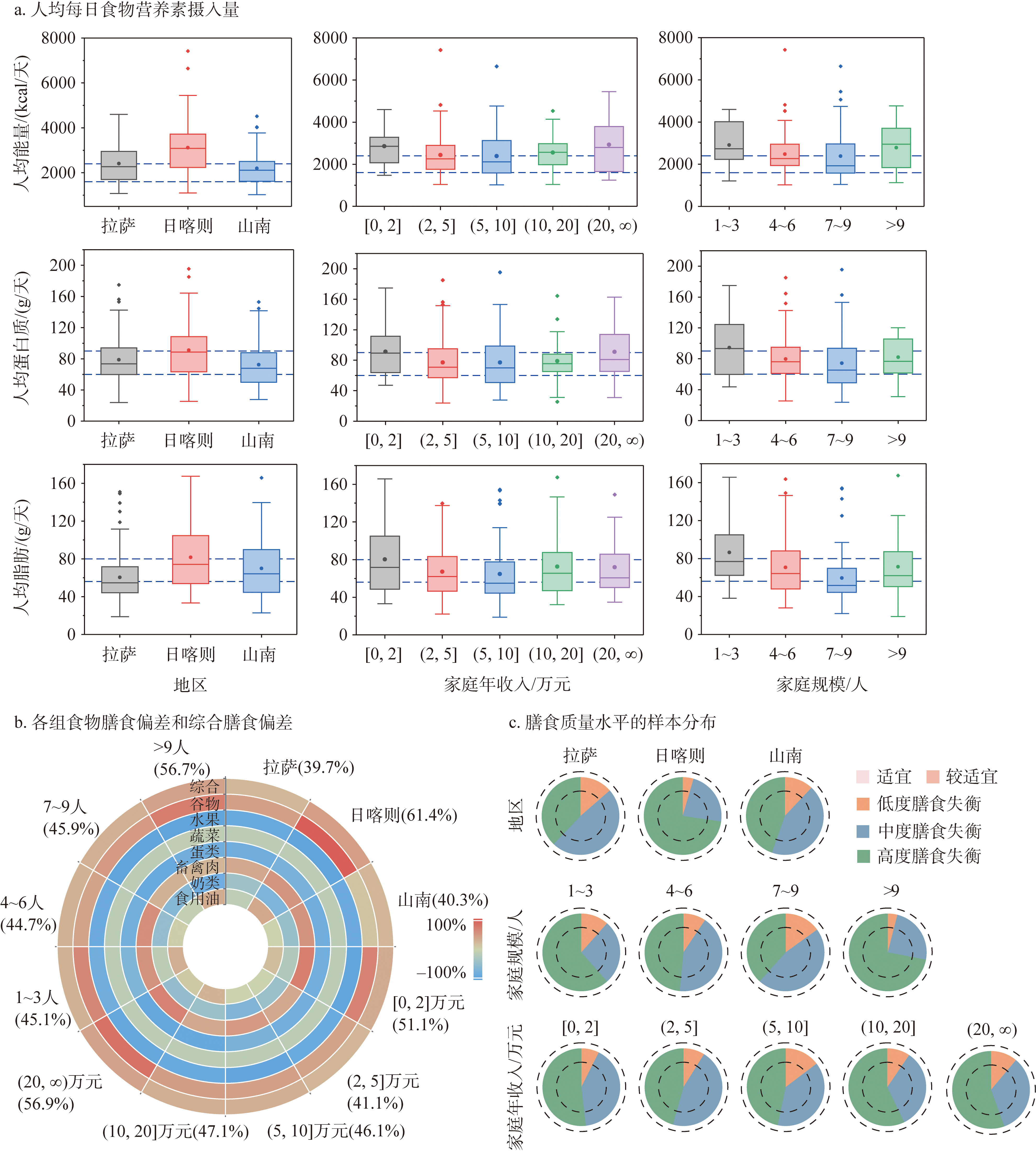 注:a图中蓝色参考线为《中国居民膳食指南(2022)》的平衡膳食模式所提供的营养素推荐值,即每天所需能量1600~2400 kcal、蛋白质60~90 g、脂肪为56~80 g。b图中()内的百分数为综合膳食偏差。