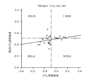 Figure 2 Moran scatter diagram of carbon dioxide emission intensity of petroleum terminal use among China’s provinces in 2011图2 2011年中国各省区石油终端利用CO2排放强度Moran散点 |