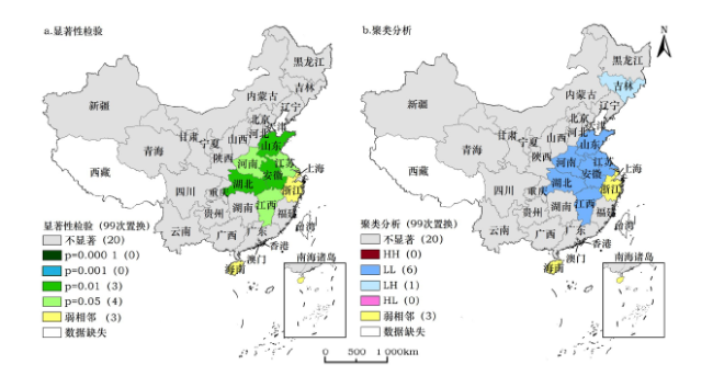 Figure 3 Spatial correlation Significance testing and cluster analysis of CO2 emission intensity of petroleum terminal use among China’s provinces in 2011图3 2011年中国各省区石油终端利用CO2排放强度空间分布相关性的显著性检验和空间聚类分析结果 |