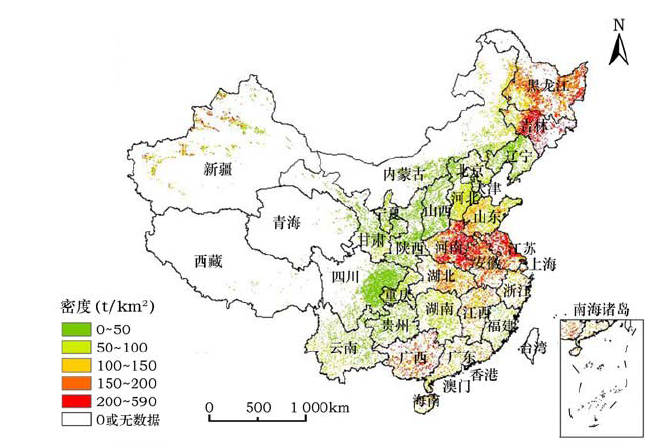 Figure 1 Density distribution of crop residue resource available for commercial energy production in 2014图1 2014年可能源化利用秸秆资源分布密度 注:香港、澳门和台湾地区无数据。 |